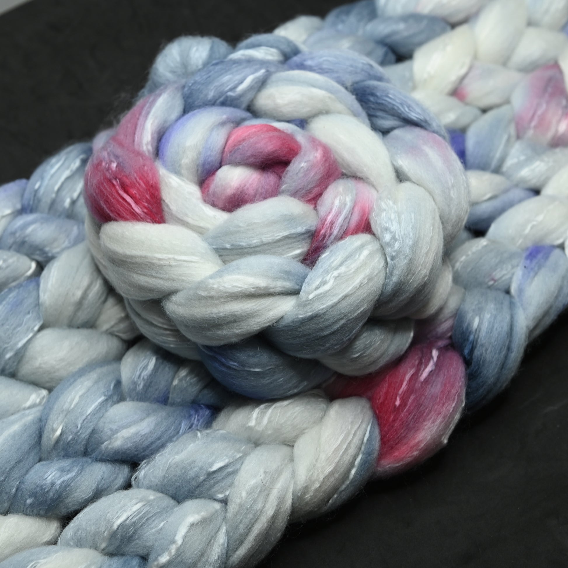 This decadent blend of 80% Fine Polwarth wool and 20% Mulberry Silk is a favorite of handspinners. Sold in 4 ounce quantities and hand dyed in small batches using hypoallergenic dyes.