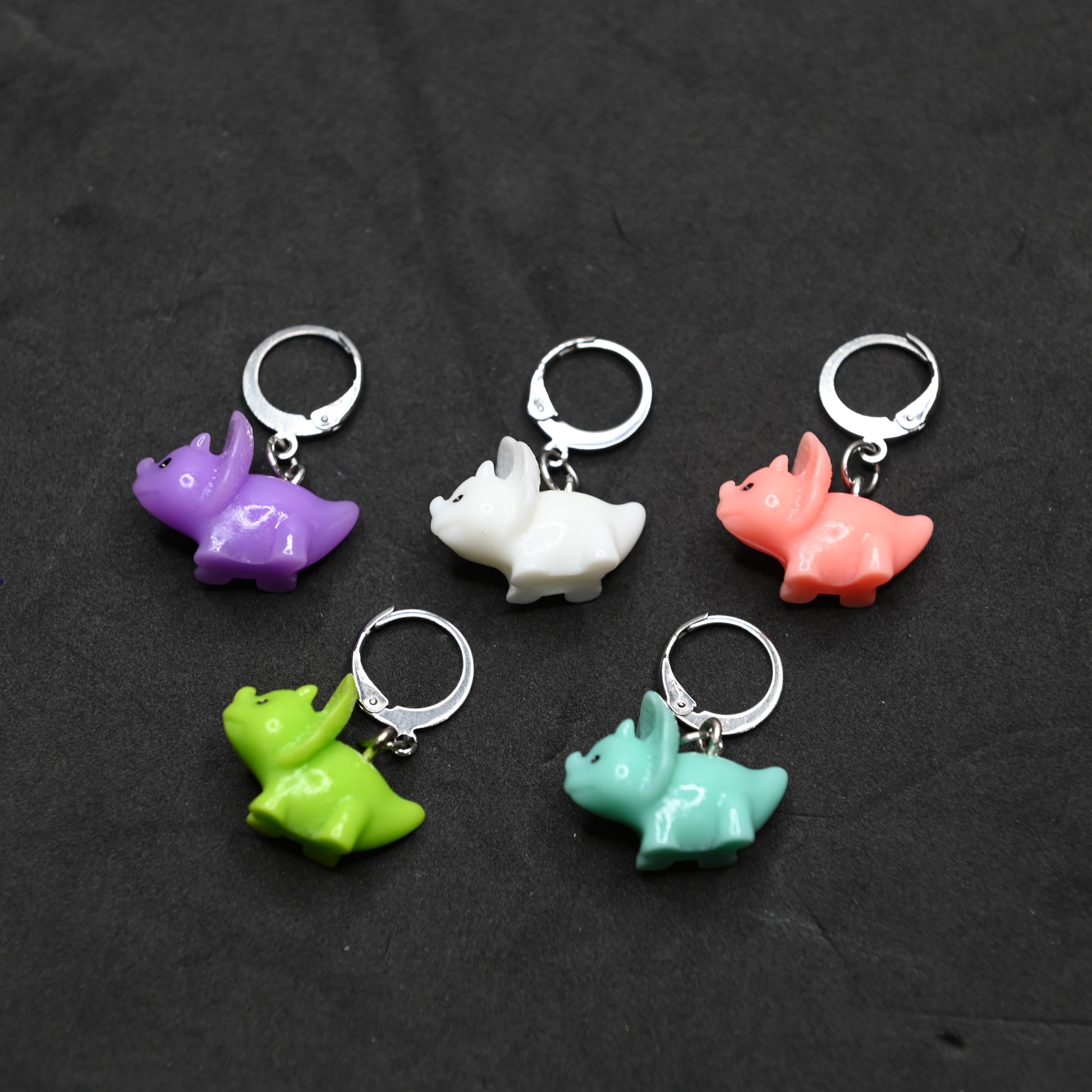 Each set contains 6 locking stitch markers with a resin Triceratops charm in 6 colors (red, pink, orange, yellow, yellow-green, baby blue), as pictured and described. Perfect for knitting or crochet or whenever you need a larger number of matching stitch markers