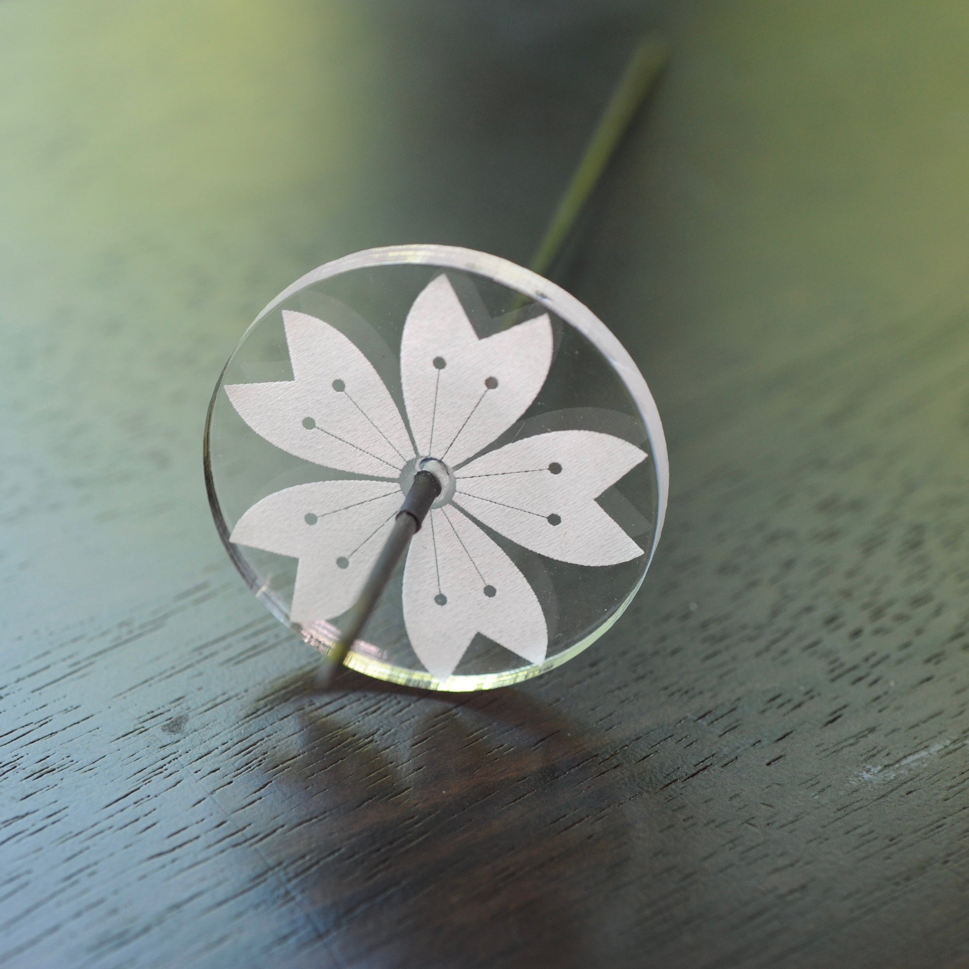 All spindles are made with an approximately 9.5 inch long carbon fiber shaft, will weigh 13 grams and will test spin for a minimum of 1 minute, 30 seconds. Spindles come with vinyl end caps for both sharpened tips. These are hookless spindles and spin best on a glass or porcelain surface - the carbon fiber tip may be damaged by other surfaces and show excessive wear.