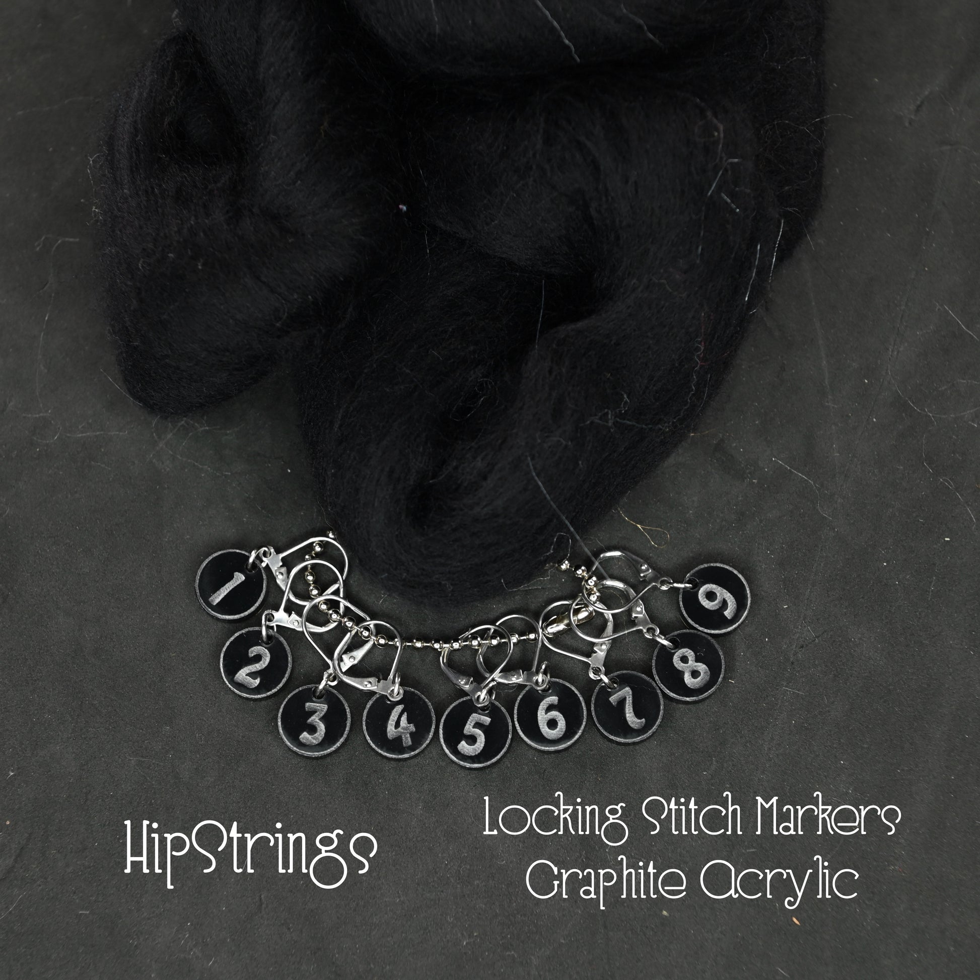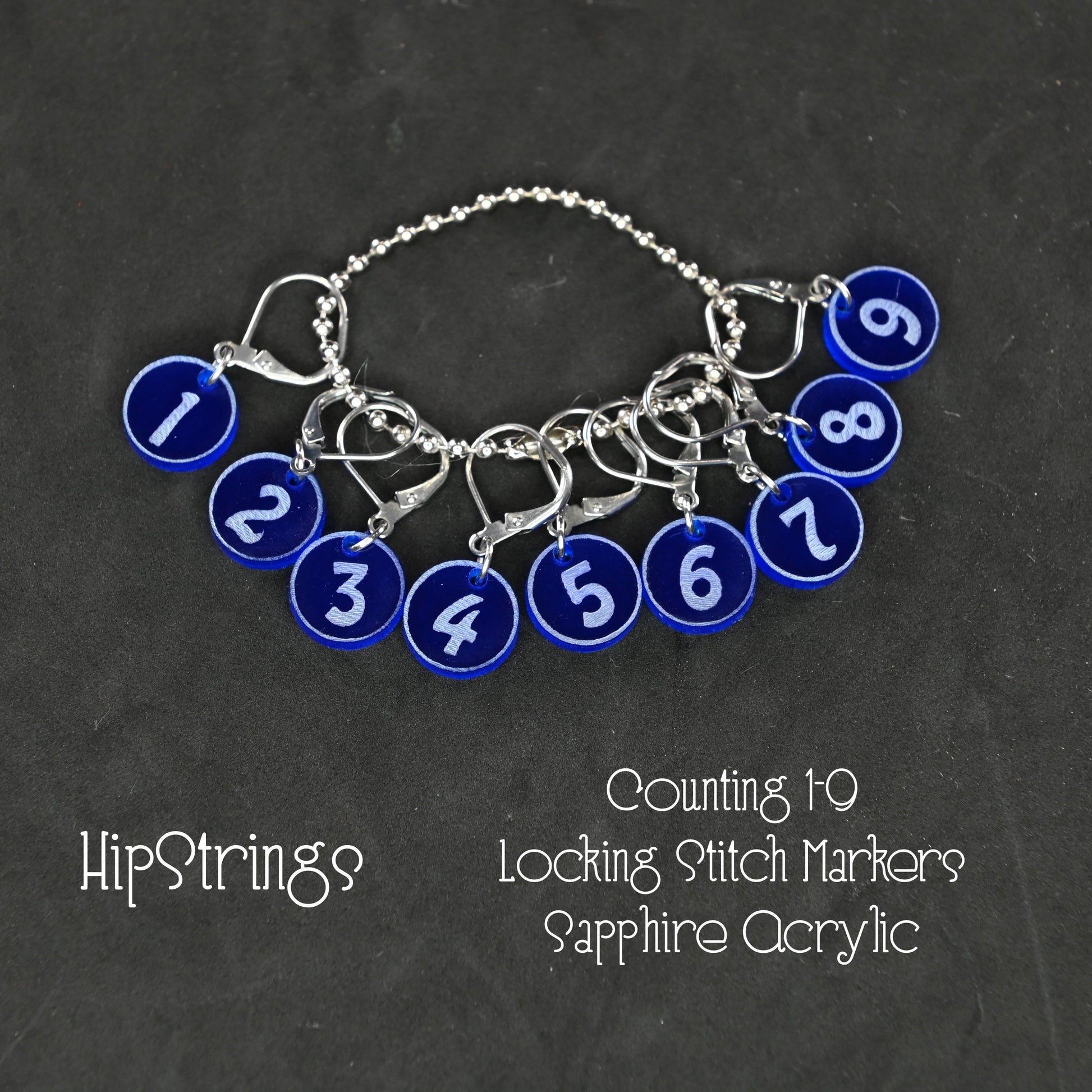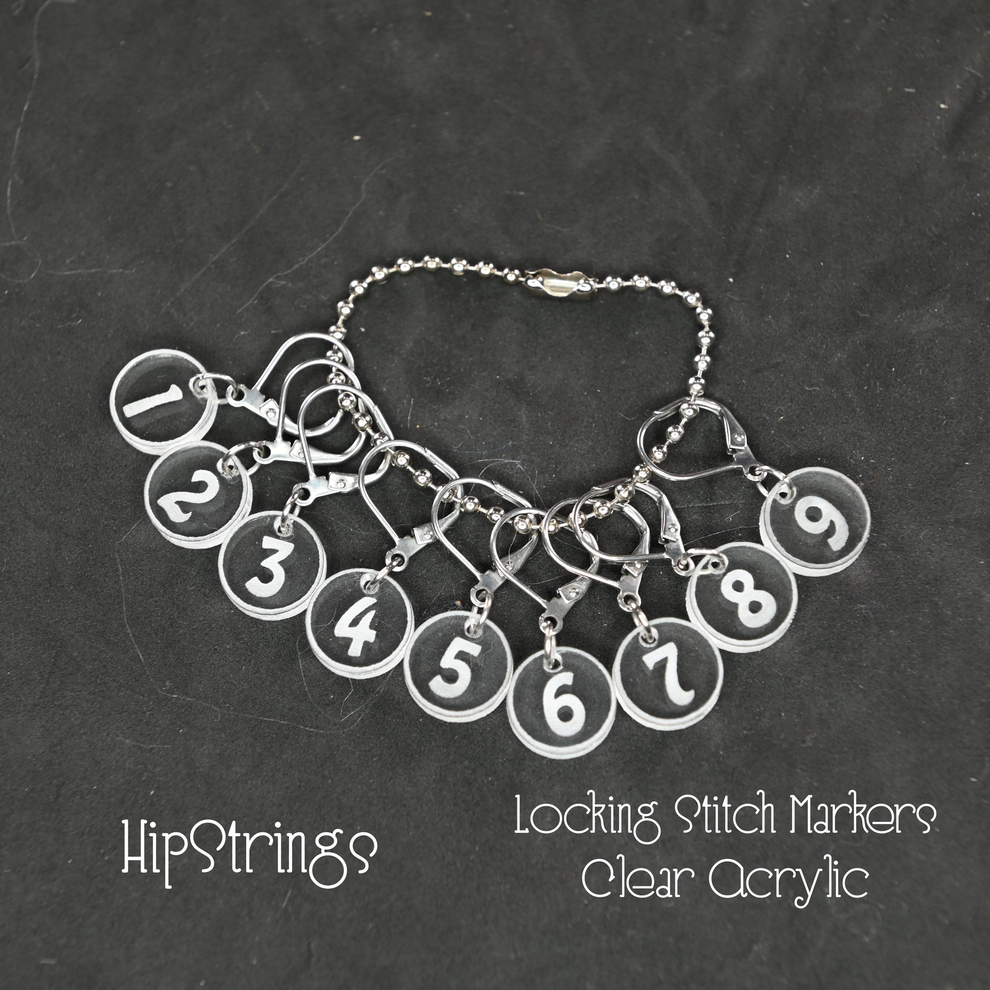 Each set contains a 1, 2, 3, 4, 5, 6, 7, 8, and 9 stitch marker. Each stitch markers features a 10 mm locking but removable stainless steel ring, with a 1/2" diameter 1/8" thick acrylic laser etched charm hanging with a separate jump ring. For use with up to a US 10 (6.0 mm) knitting needle.