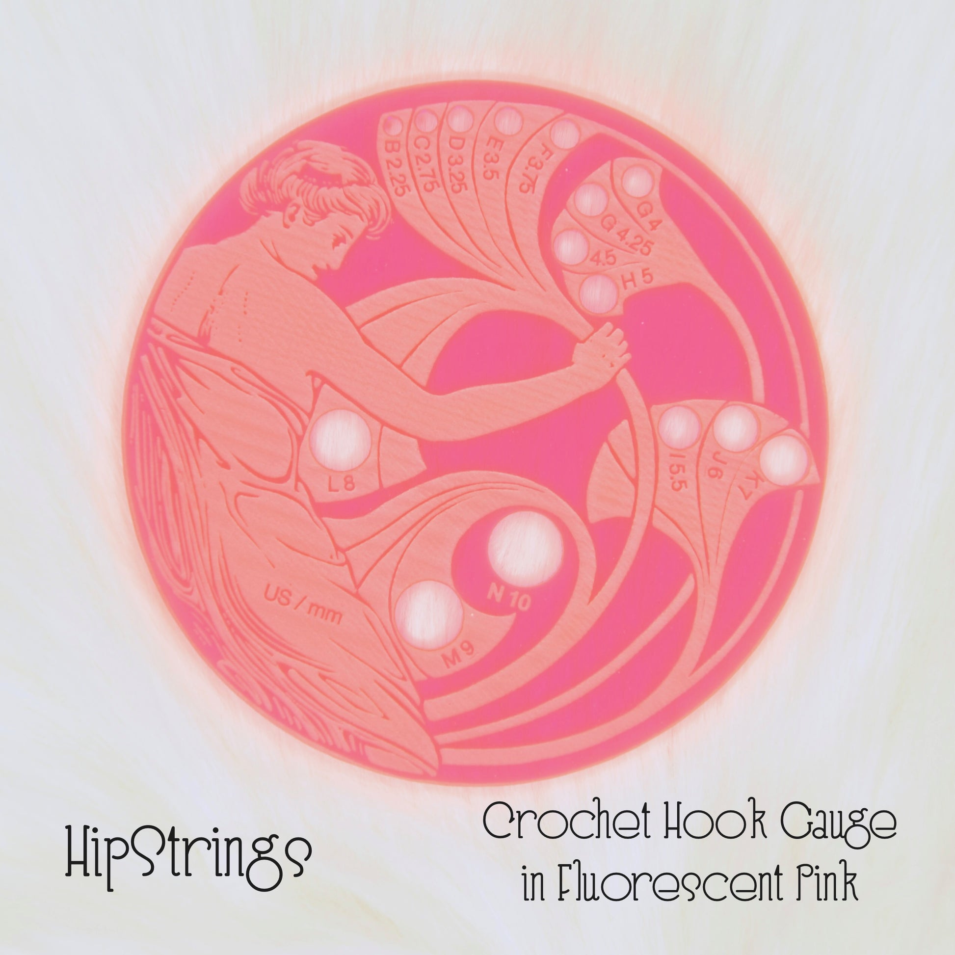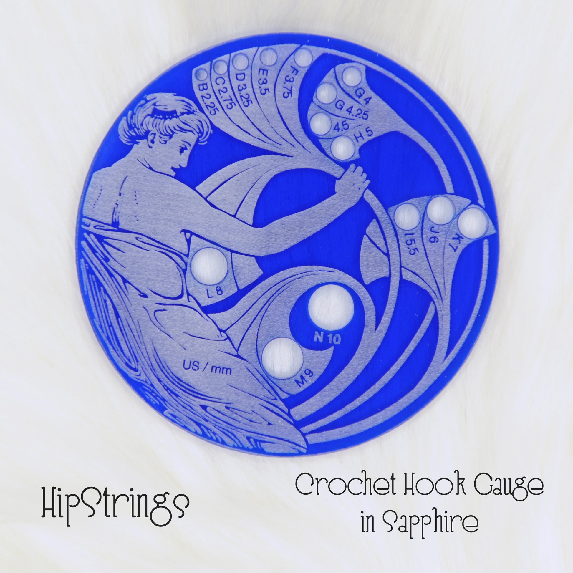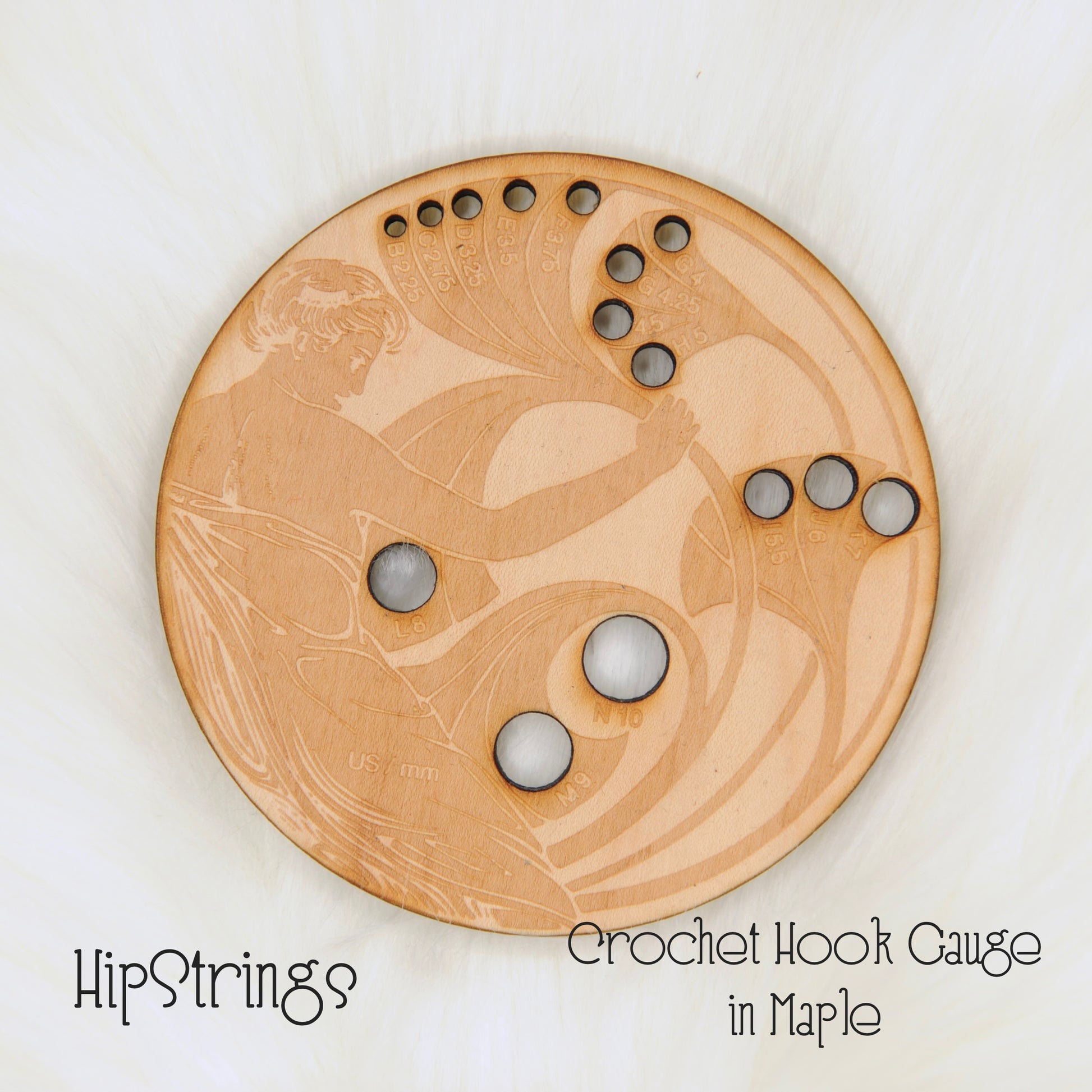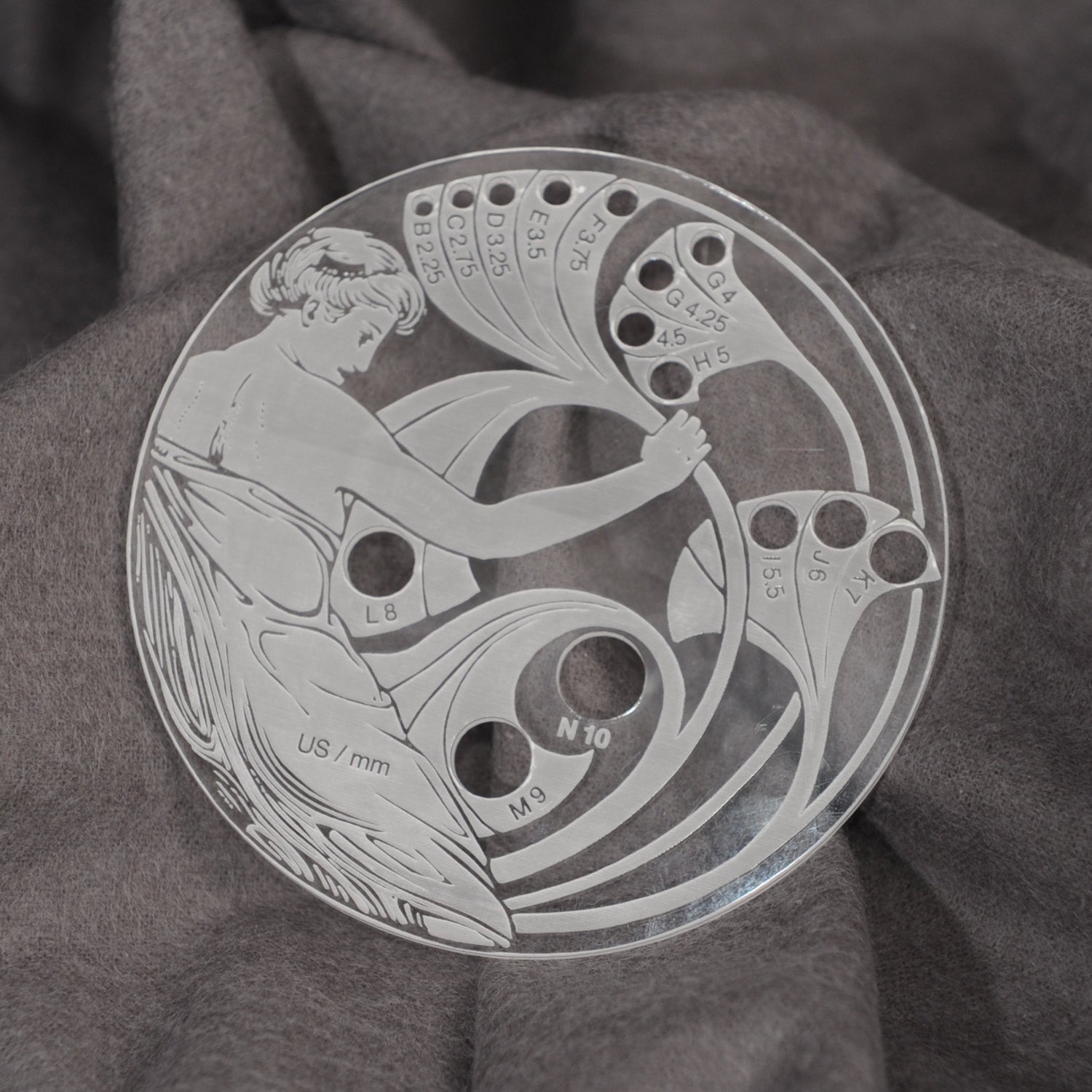 Perfect for sizing crochet hooks so that you always match the right hook to the right project! It also features a laser etched art nouveau design and is made from 0.125" inch thick clear acrylic or 0.25 inch hardwood plywood.