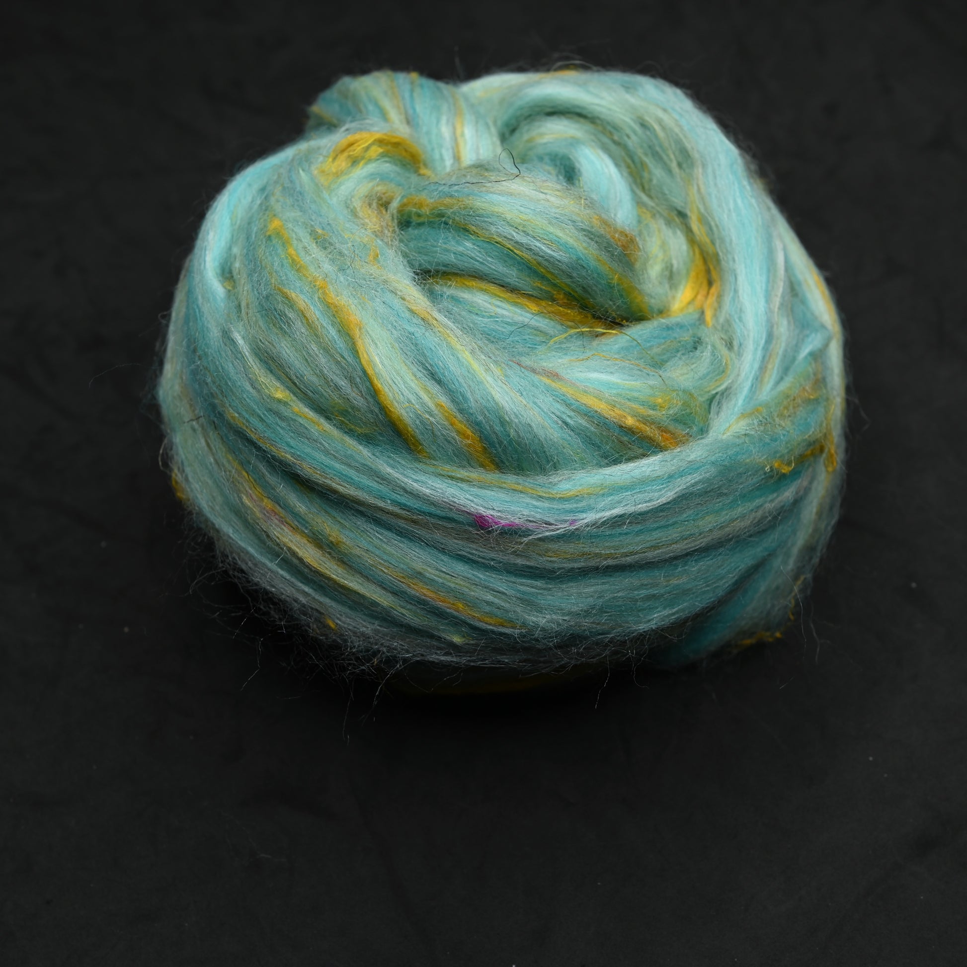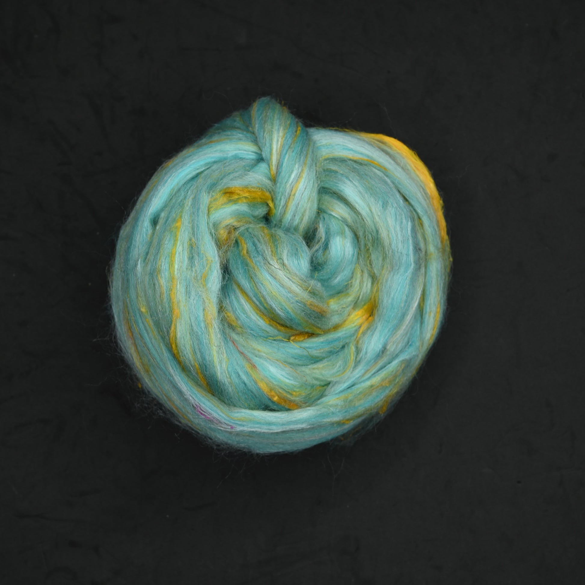 Dumpster Fire is a textured Signature Blend - blips of brightly colored Sari Silk will integrate into your spinning as bright, textured bits of gold against a cheerful, perfect minty aqua. Sold in 4 ounce quantities, Dumpster Fire contains 50% Merino wool, 25% Shetland wool, 12.5% Tussah Silk and 12.5% Sari Silk.