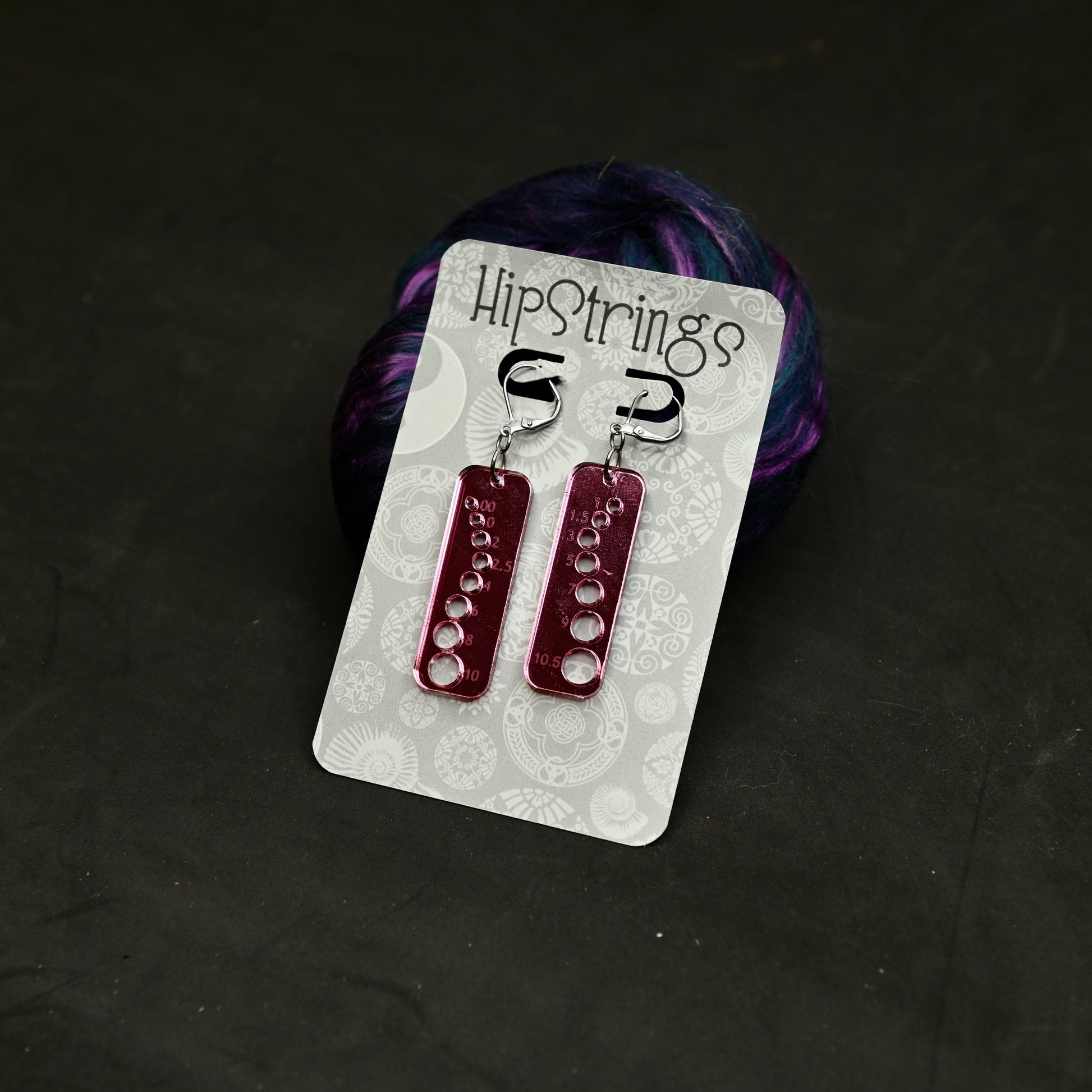 Always be prepared with these stylish knitting needle gauge earrings. Each pair of earrings contains holes for needles sized US 00, 0, 1, 1.5, 2, 2.5, 3, 4, 5, 6, 7, 8, 9, 10 and US 10.5. Earrings are made using hypoallergenic surgical stainless steel leverbacks.