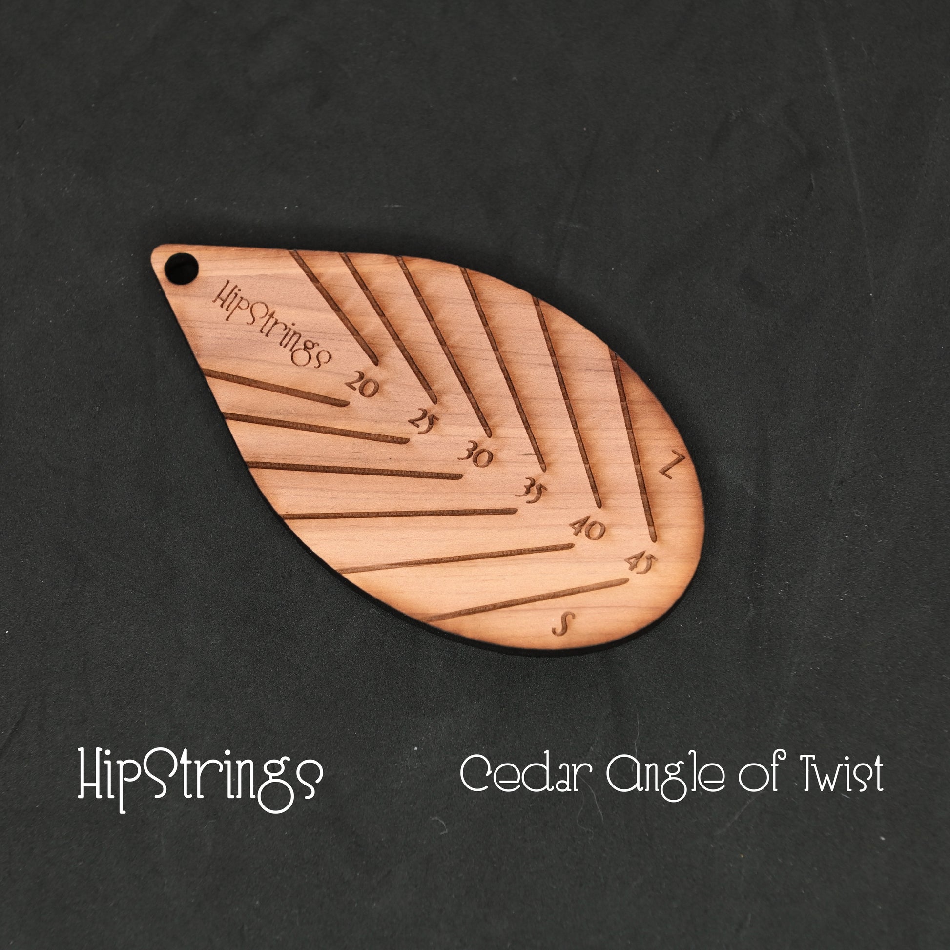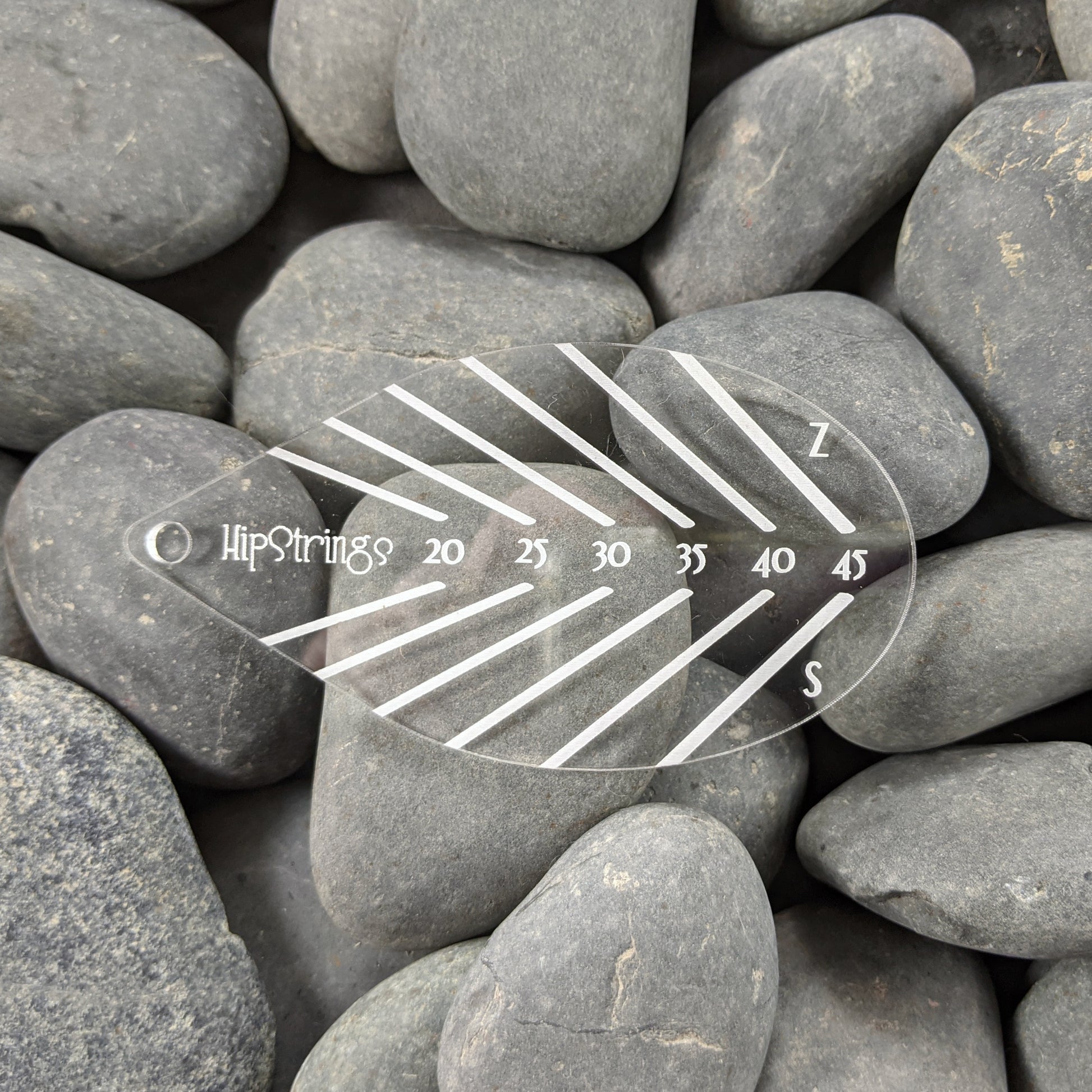 Ready to take control of your spinning? Tired of waiting until you've plied a yarn to see if it is balanced? This angle of twist gauge will help you maintain a consistent twist throughout your singles and plying. Just place your single (plied back on itself) or plied yarn on top of the gauge and line it up with the angle that best matches the twist in your fiber. Angles are mirrored so you can easily determine if you are dealing with "S" or "Z" twist. For a single plied back on itself, the direction of twist determined by the gauge is opposite of the direction of the twist in the actual single by itself (A S spun single will ply back on itself in the Z direction, for example).
