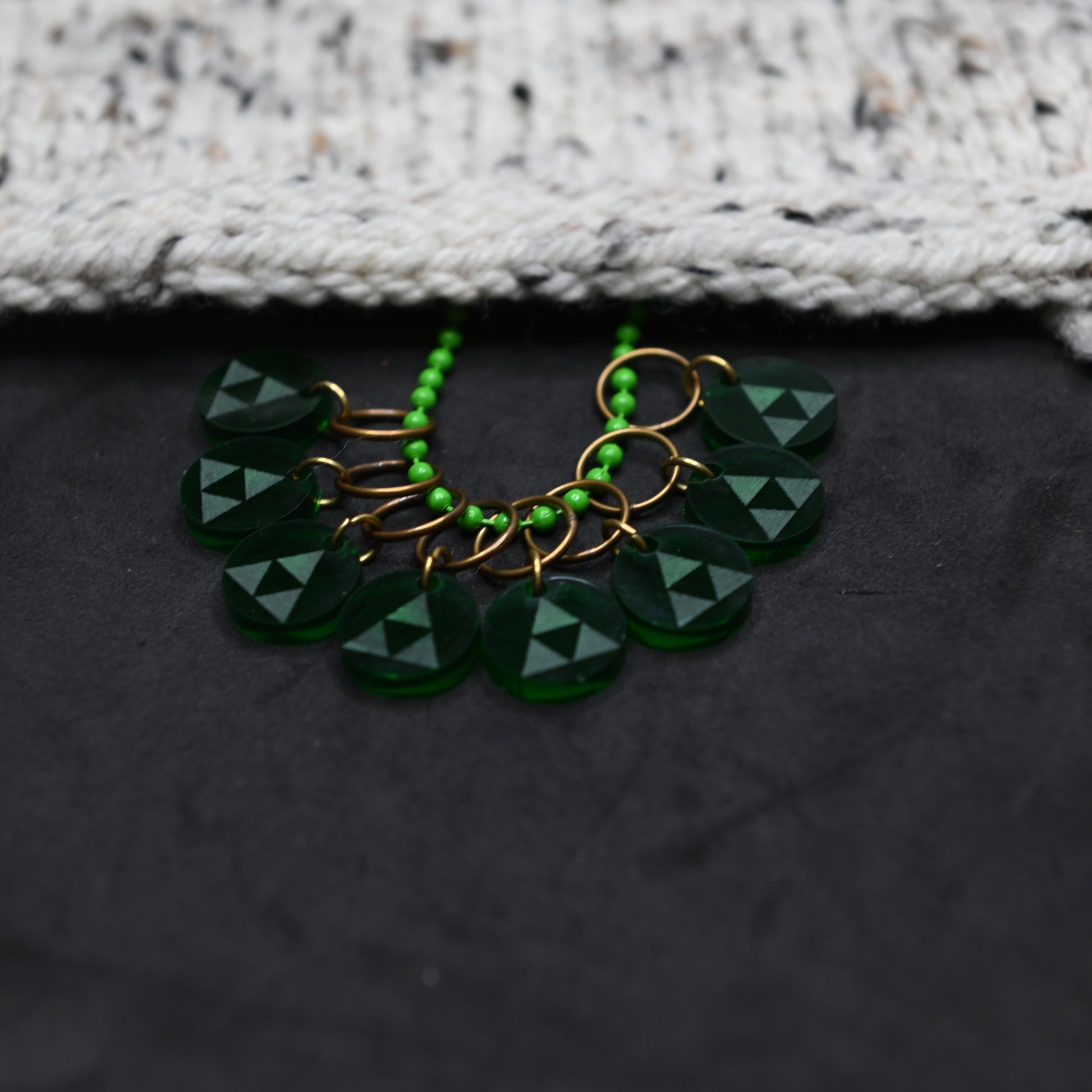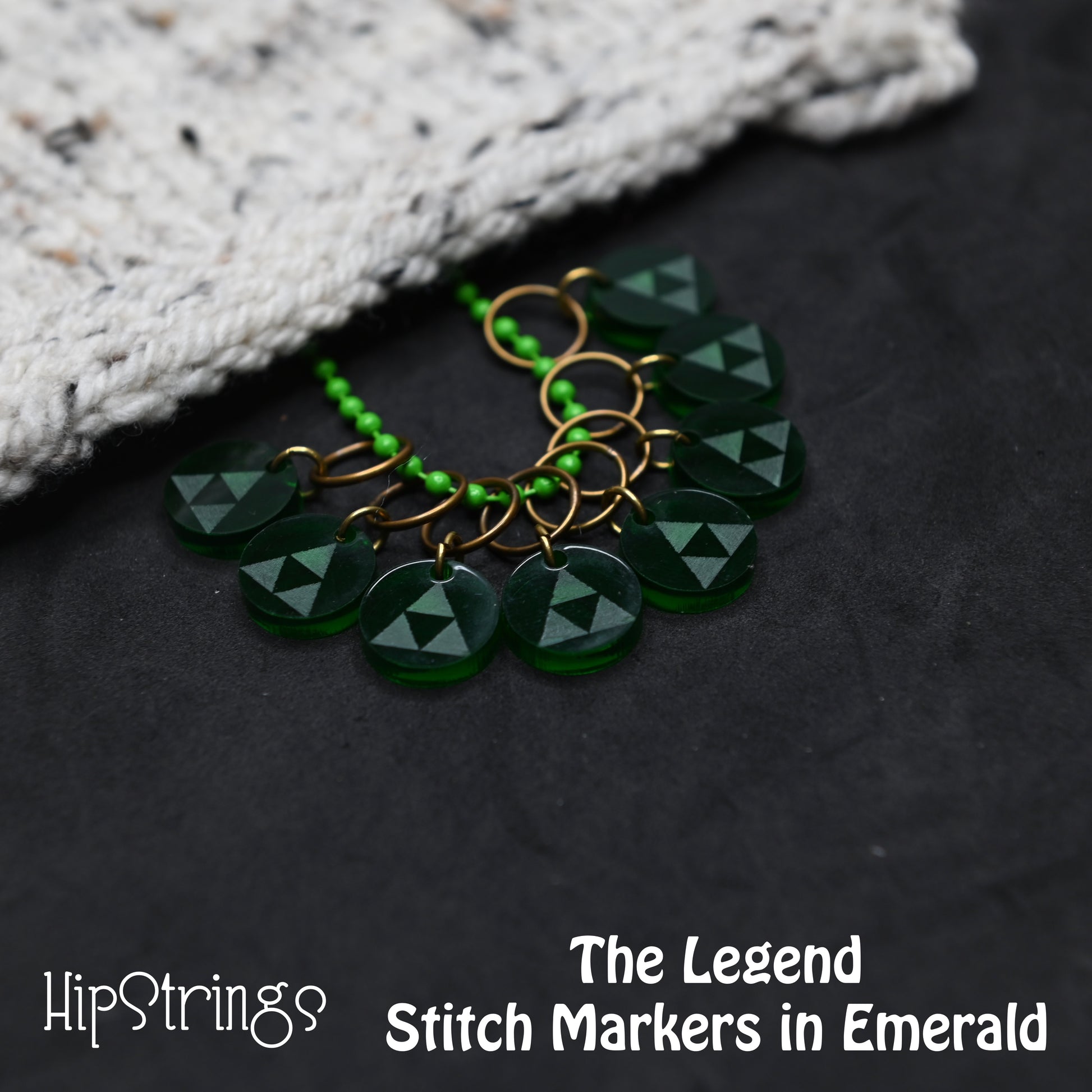 Each set contains 8 The Legend design stitch markers, as pictured and described in emerald acrylic on bronzed closed rings. Perfect for marking raglan shaping or whenever you need a larger number of matching stitch markers